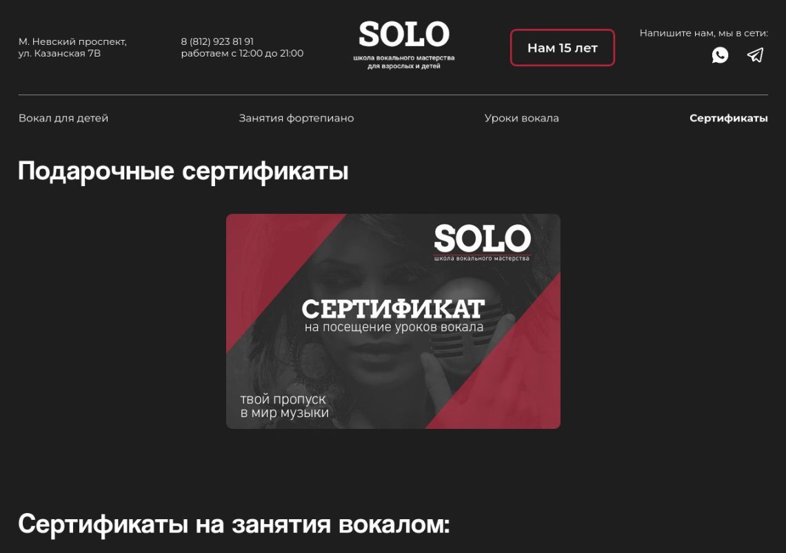 Вы хотите порадовать творческого человека, который обожает петь или мечтает заниматься вокалом профессионально? Тогда закажите подарочный сертификат школы Solo! Выберите сертификат на сайте и закажите прямо сейчас!